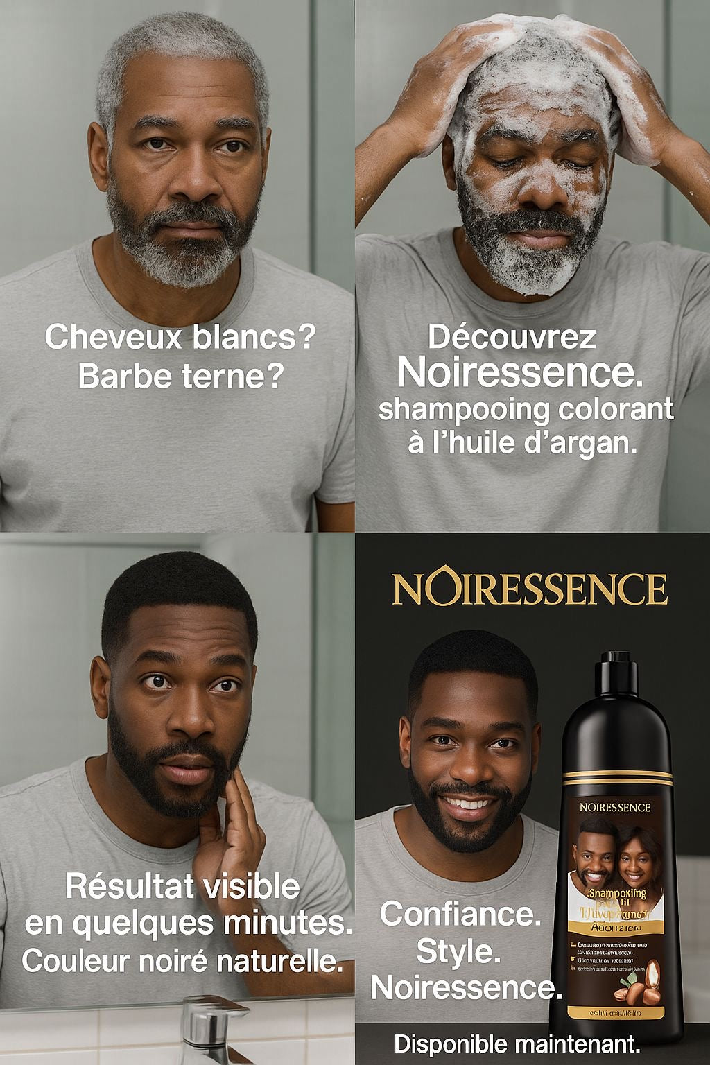 Noiressence – Shampooing Noircissant à l’Huile d’Argan offre une coloration noire intense en seulement 10 à 15 minutes, sans taches ni résidus sur le cuir chevelu. Sa formule 100 % naturelle, enrichie à l’huile d’argan, nourrit et renforce cheveux et barbe en douceur.